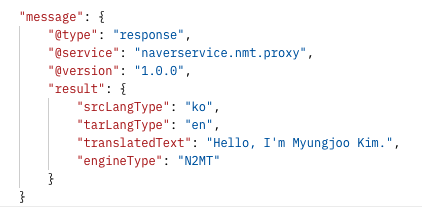 파파고 API 응답의 경우 아래와 같이 특수문자를 포함한 형태로 오기 때문에 String으로 구성된 변수명만으로는 응답을 받아올 수 없다. 그러므로 @JsonProperty 사용해주었다.