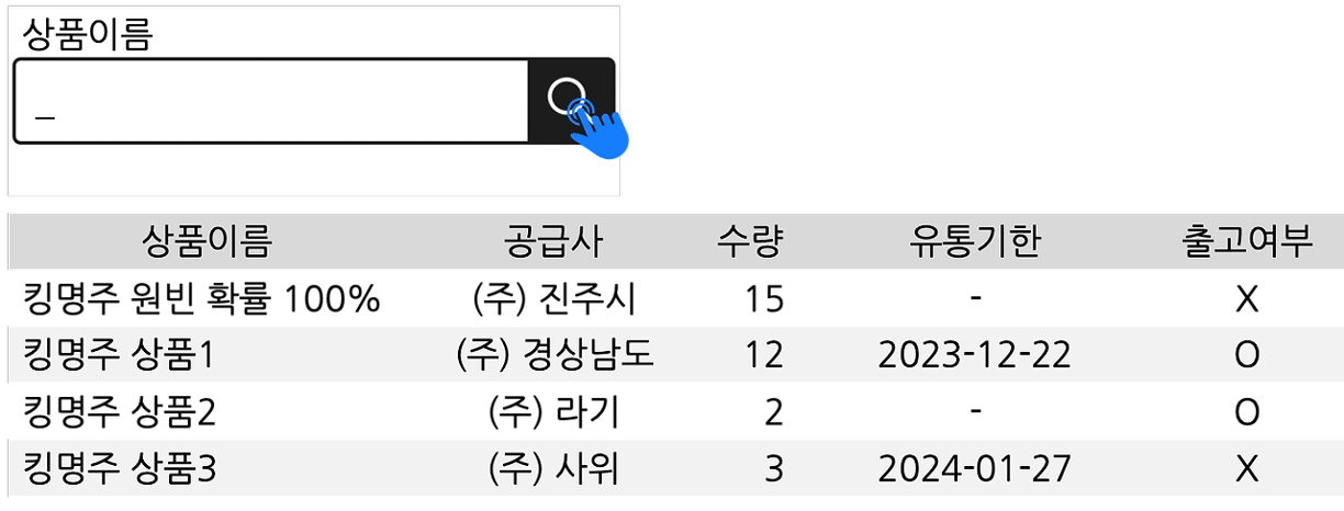 이런 화면이 있고 가정하겠다. 전체검색 결과 총 4개의 상품을 확인할 수 있다. 품질 팀에서 킹명주 원빈 확률 100% 상품을 검색하기 위해 검색창에 %를 입력했다.